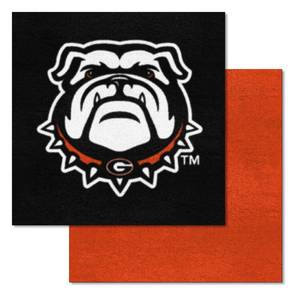| Georgia Bulldogs Team Carpet Tiles - 45 Sq Ft. Easy to install, adhesive strips included No padding or underlay required 10 team and 10 accent color tiles Smooth recycled backing 9 Ounce, 100 % Nylon Face Covers 45 square feet when assembled University of Georgia in Georgia |