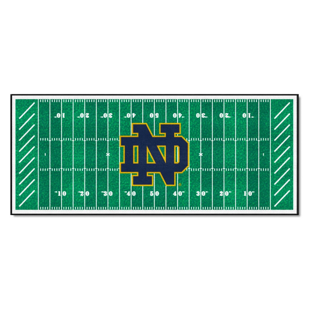 | Notre Dame Fighting Irish Field Runner Mat - 30in. x 72in. 9 Ounce, 100 % Nylon Face Recycled vinyl backing for a durable and longer-lasting product Machine made and tufted in the USA Non-skid backing with serged borders for added durability Machine washable; vacuum regularly and spot clean for any easy and quick clean Officially licensed and chromojet-printed in true team colors for vibrant, lasting color Notre Dame in Indiana |