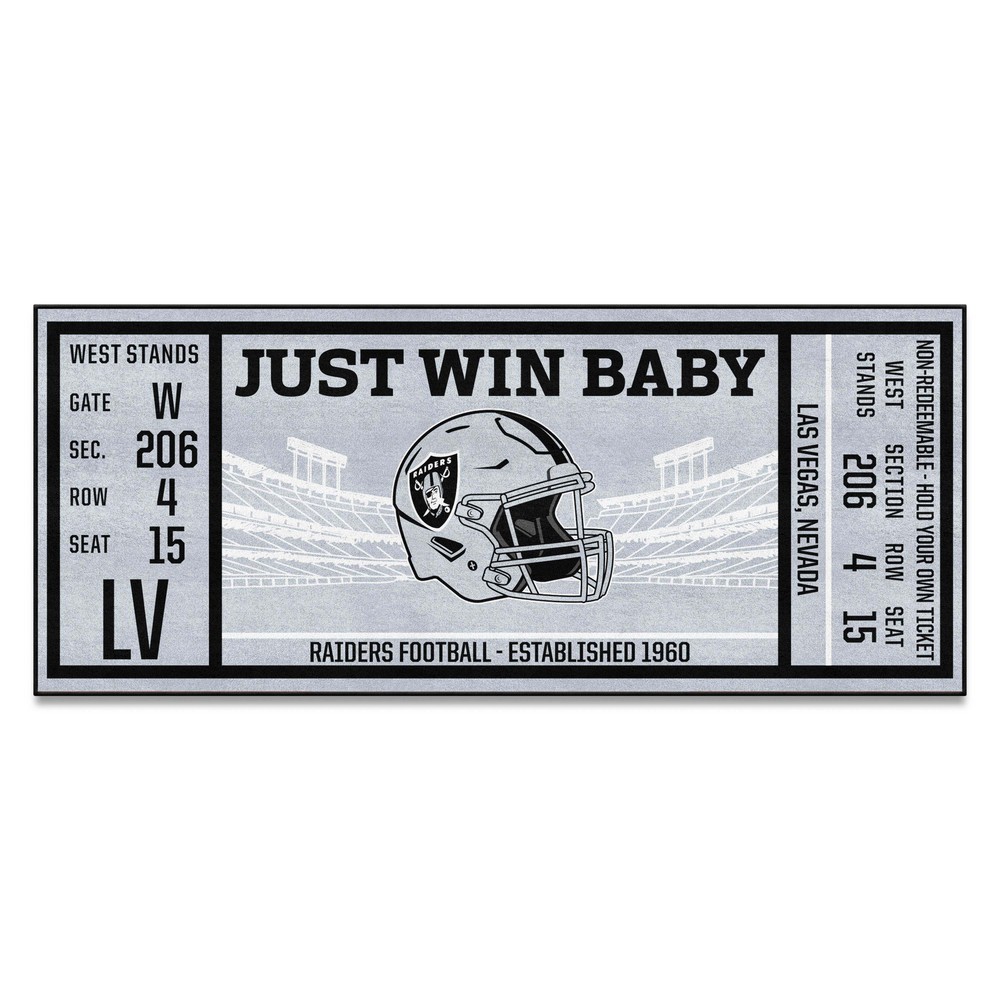| Las Vegas Raiders Ticket Runner Rug - 30in. x 72in. 9 Ounce, 100 % Nylon Face Recycled vinyl backing for a durable and longer-lasting product Machine made and tufted in the USA Non-skid backing with serged borders for added durability Machine washable; vacuum regularly and spot clean for any easy and quick clean Officially licensed and chromojet-printed in true team colors for vibrant, lasting color NFL - Las Vegas Raiders in Nevada NFL National Football League |