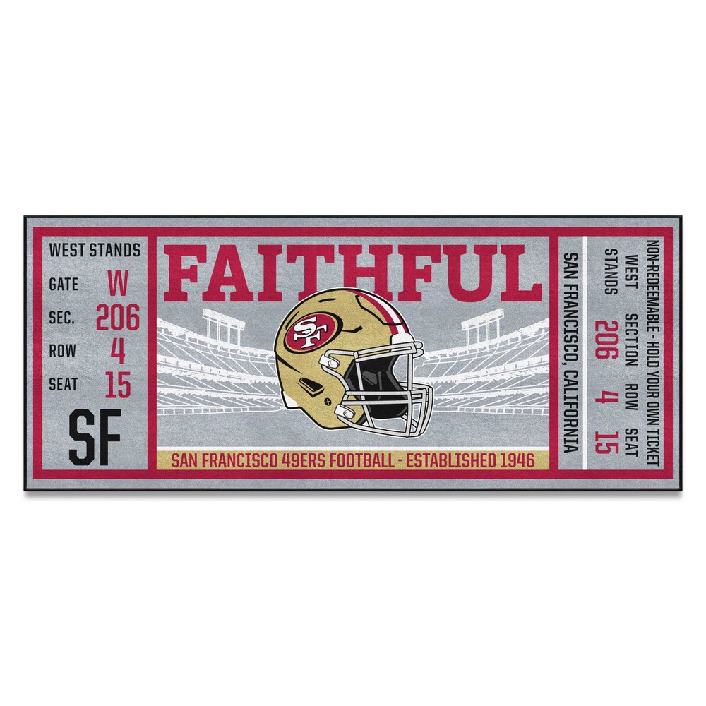 | San Francisco 49ers Ticket Runner Rug - 30in. x 72in. 9 Ounce, 100 % Nylon Face Recycled vinyl backing for a durable and longer-lasting product Machine made and tufted in the USA Non-skid backing with serged borders for added durability Machine washable; vacuum regularly and spot clean for any easy and quick clean Officially licensed and chromojet-printed in true team colors for vibrant, lasting color NFL - San Francisco 49ers in California NFL National Football League |