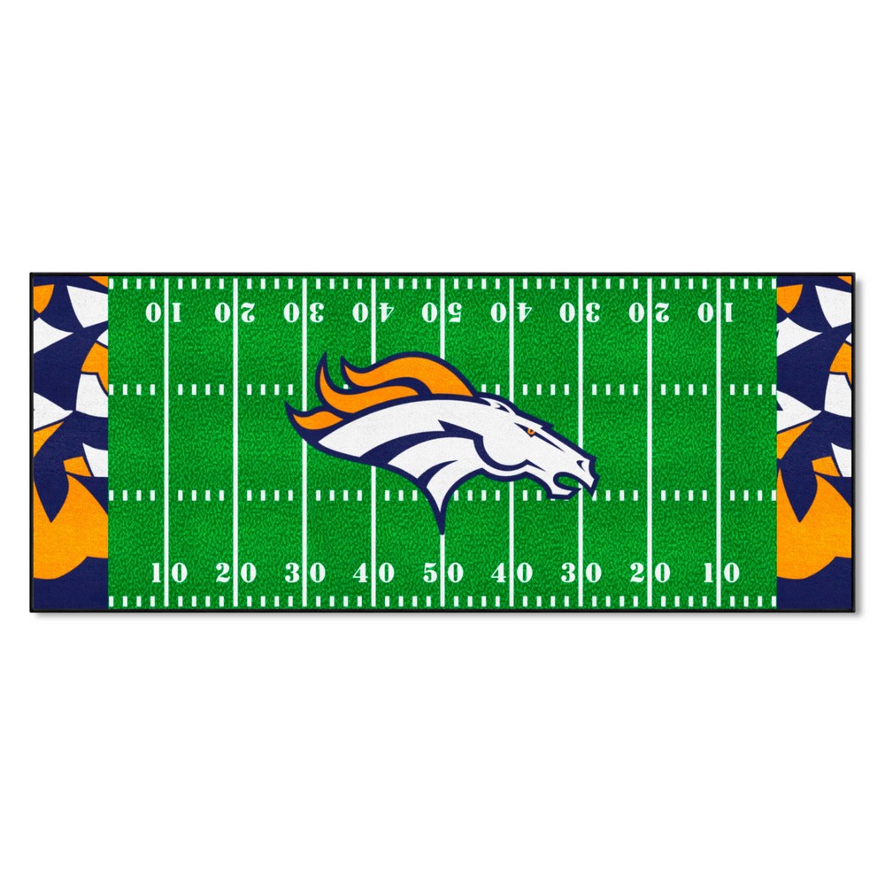 | Denver Broncos Football Field Runner Mat - 30in. x 72in. XFIT Design 9 Ounce, 100 % Nylon Face Recycled vinyl backing for a durable and longer-lasting product Machine made and tufted in the USA Non-skid backing with serged borders for added durability Machine washable; vacuum regularly and spot clean for any easy and quick clean Officially licensed and chromojet-printed in true team colors for vibrant, lasting color NFL - Denver Broncos in Colorado NFL National Football League |