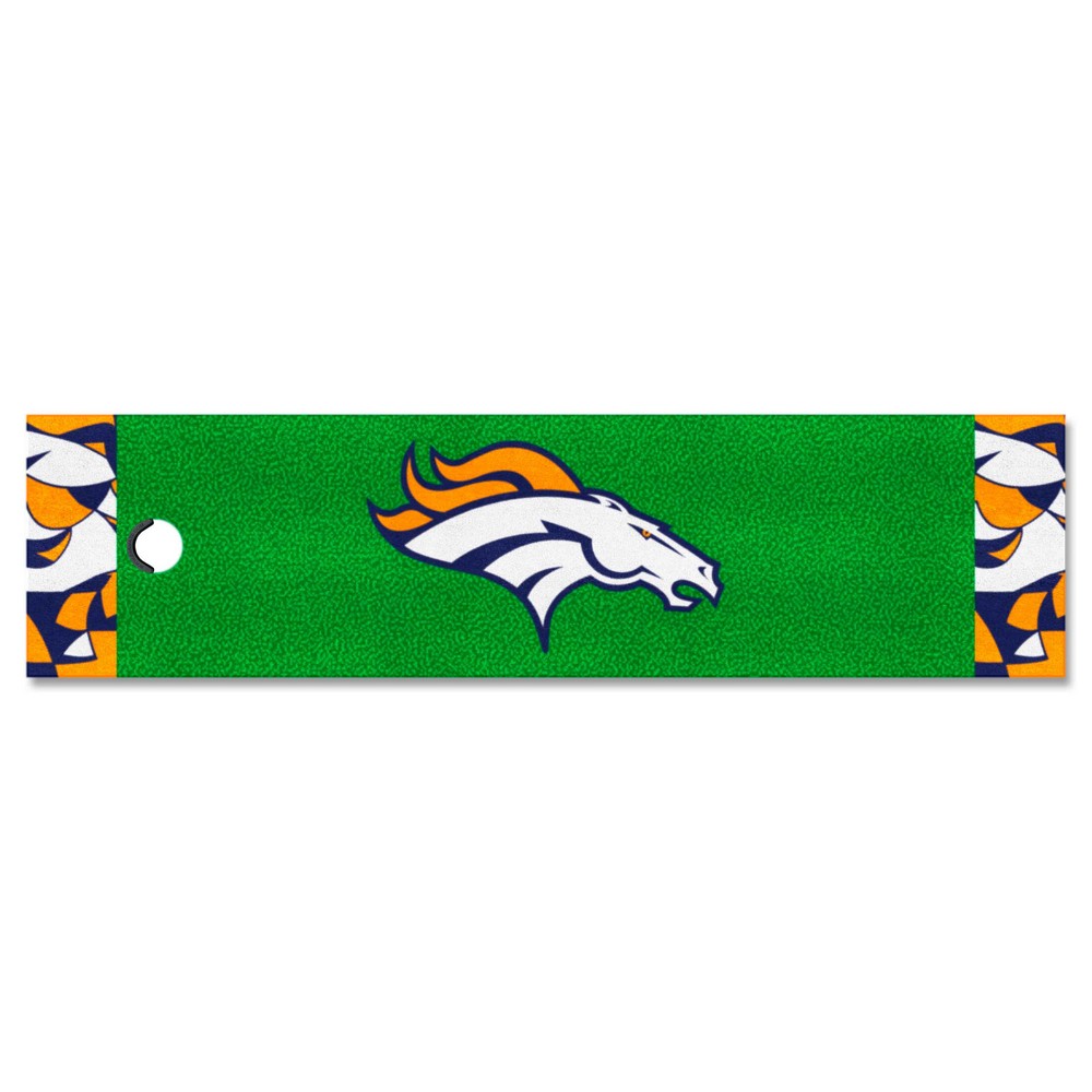 | Denver Broncos Putting Green Mat - 1.5ft. x 6ft. Realistic putting surface (11* on golf Stimpmeter) Includes putting target barrier/backstop Durable vinyl backing keeps mat in place 100% Nylon Face Doubles as a runner when not in use Officially licensed and chromojet printed in true team colors NFL - Denver Broncos in Colorado NFL National Football League |