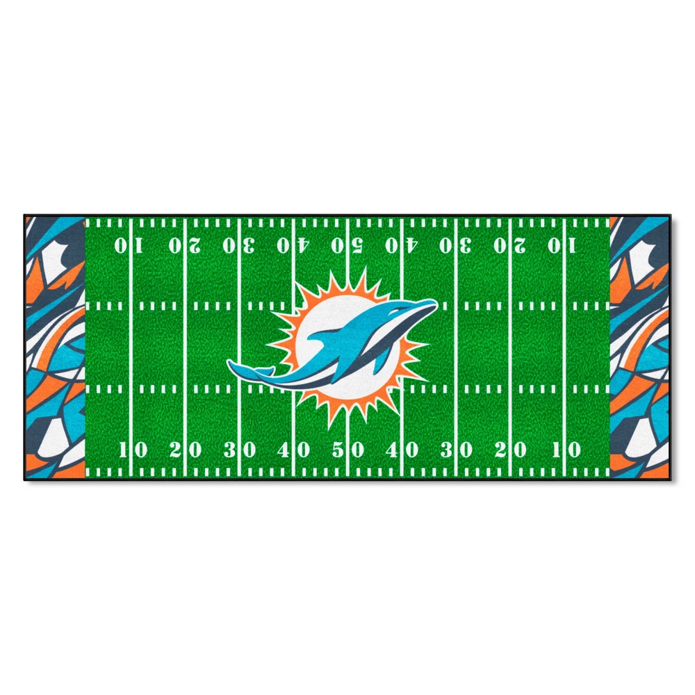 | Miami Dolphins Football Field Runner Mat - 30in. x 72in. XFIT Design 9 Ounce, 100 % Nylon Face Recycled vinyl backing for a durable and longer-lasting product Machine made and tufted in the USA Non-skid backing with serged borders for added durability Machine washable; vacuum regularly and spot clean for any easy and quick clean Officially licensed and chromojet-printed in true team colors for vibrant, lasting color NFL - Miami Dolphins in Florida NFL National Football League |