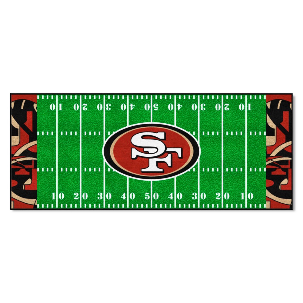| San Francisco 49ers Football Field Runner Mat - 30in. x 72in. XFIT Design 9 Ounce, 100 % Nylon Face Recycled vinyl backing for a durable and longer-lasting product Machine made and tufted in the USA Non-skid backing with serged borders for added durability Machine washable; vacuum regularly and spot clean for any easy and quick clean Officially licensed and chromojet-printed in true team colors for vibrant, lasting color NFL - San Francisco 49ers in California NFL National Football League |