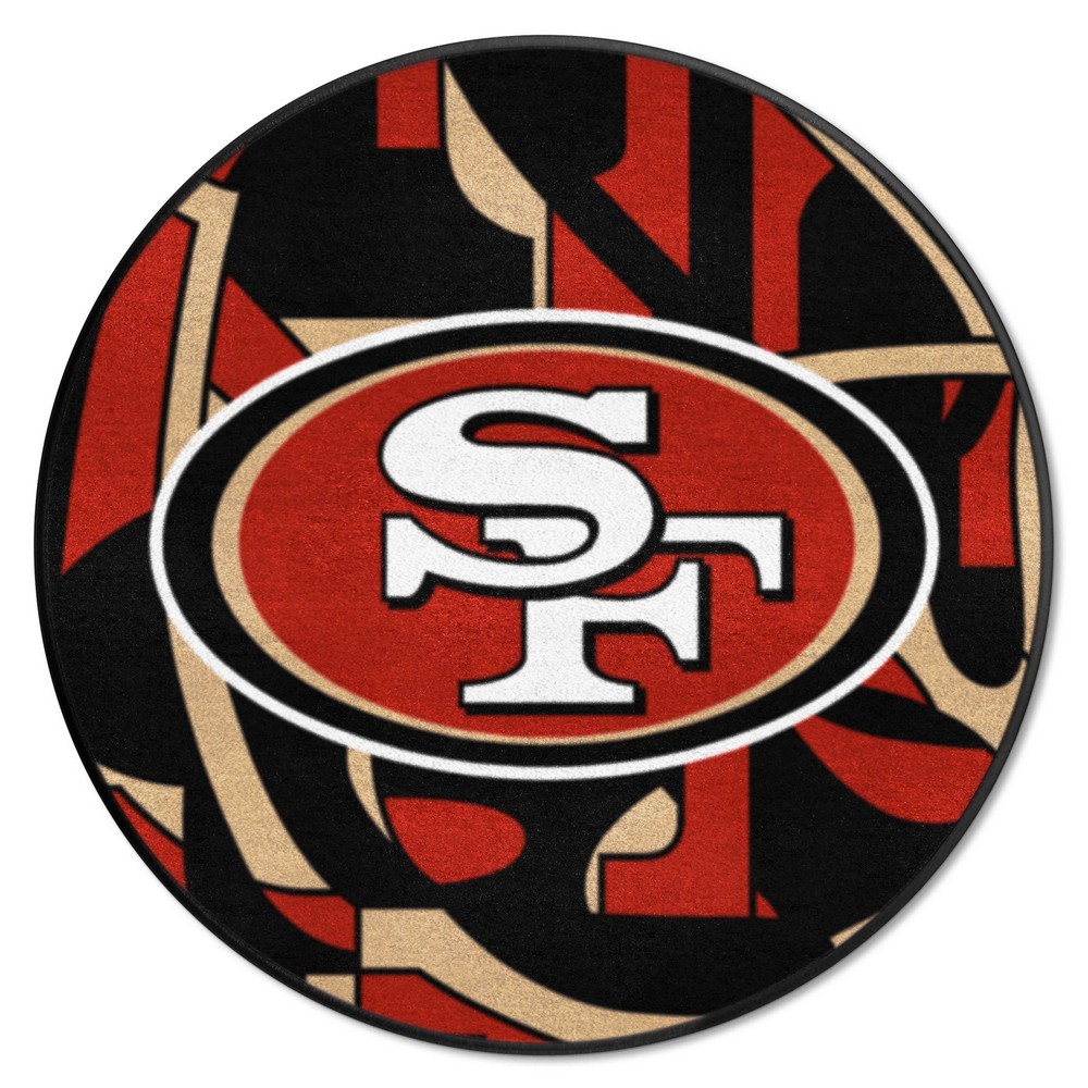 | San Francisco 49ers Roundel Rug - 27in. Diameter XFIT Design 9 Ounce, 100 % Nylon Face Recycled vinyl backing for a durable and longer-lasting product Machine made and tufted in the USA Non-skid backing with taped borders for added durability Machine washable; vacuum regularly and spot clean for any easy and quick clean Officially licensed and chromojet-printed in true team colors for vibrant, lasting color NFL - San Francisco 49ers in California NFL National Football League |