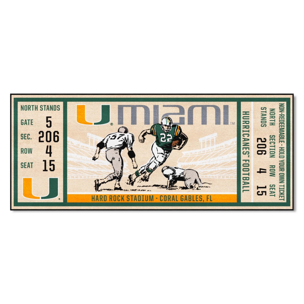 | Miami Hurricanes Ticket Runner Rug - 30in. x 72in. 9 Ounce, 100 % Nylon Face Recycled vinyl backing for a durable and longer-lasting product Machine made and tufted in the USA Non-skid backing with serged borders for added durability Machine washable; vacuum regularly and spot clean for any easy and quick clean Officially licensed and chromojet-printed in true team colors for vibrant, lasting color University of Miami in Florida |