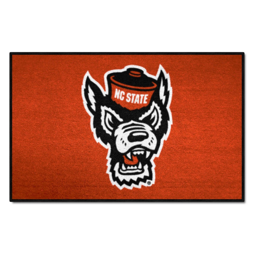 | NC State Wolfpack Starter Mat Accent Rug - 19in. x 30in., Wolf Logo 9 Ounce, 100 % Nylon Face Recycled vinyl backing for a durable and longer-lasting product Machine made and tufted in the USA Non-skid backing with serged borders for added durability Machine washable; vacuum regularly and spot clean for any easy and quick clean Officially licensed and chromojet-printed in true team colors for vibrant, lasting color North Carolina State University in North Carolina |