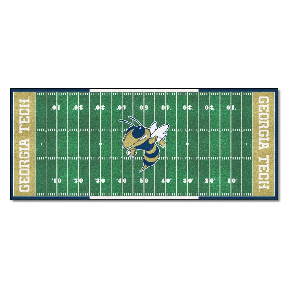 | Georgia Tech Yellow Jackets Field Runner Mat - 30in. x 72in., Buzz 9 Ounce, 100 % Nylon Face Recycled vinyl backing for a durable and longer-lasting product Machine made and tufted in the USA Non-skid backing with serged borders for added durability Machine washable; vacuum regularly and spot clean for any easy and quick clean Officially licensed and chromojet-printed in true team colors for vibrant, lasting color Georgia Tech in Georgia |