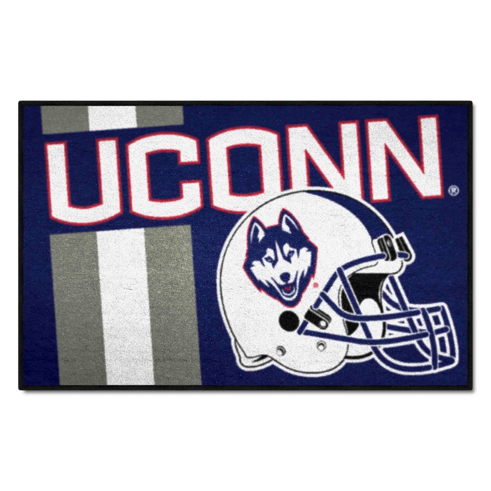 | UConn Huskies Starter Mat Accent Rug - 19in. x 30in. 9 Ounce, 100 % Nylon Face Recycled vinyl backing for a durable and longer-lasting product Machine made and tufted in the USA Non-skid backing with serged borders for added durability Machine washable; vacuum regularly and spot clean for any easy and quick clean Officially licensed and chromojet-printed in true team colors for vibrant, lasting color University of Connecticut in Connecticut |
