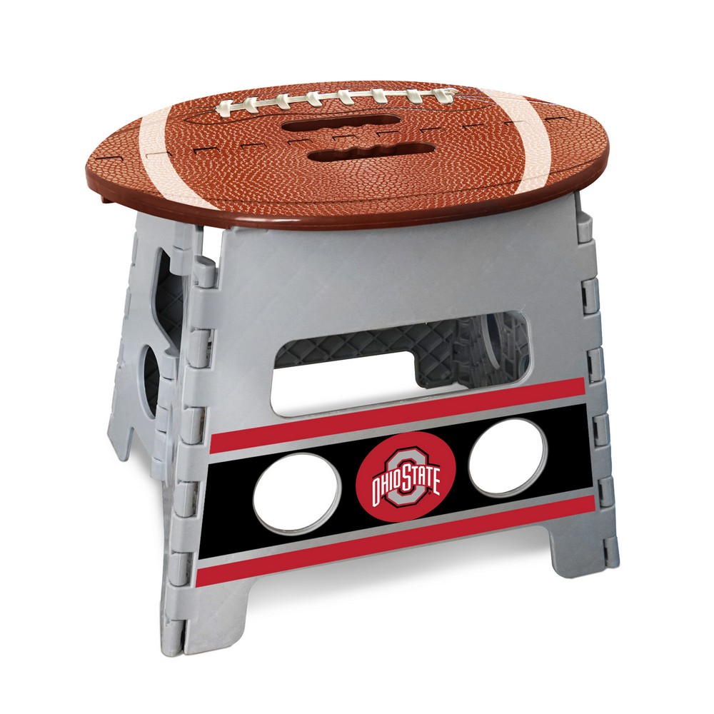 | Ohio State Buckeyes Folding Step Stool - 13in. Rise Supports 250 lbs. Folds flat for easy storage Handle makes transportation easy Made of light weight durable plastic Rubber feet means stool stays in place True Team Colors Ohio State University in Ohio |