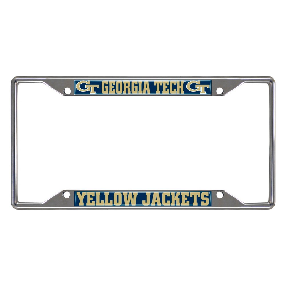 | Georgia Tech Yellow Jackets Chrome Metal License Plate Frame, 6.25in x 12.25in Made of chrome metal with a durable finish that resists the elements Team logo is domed and features vibrant colors that catch the eye 4 pre-drilled holes ensure a safe and secure fit, plus no rattling noises while driving Slimline design helps keep registration tag visible Fits most standard plates, measures 6.25" x 12.25" Screws not included Georgia Tech in Georgia |