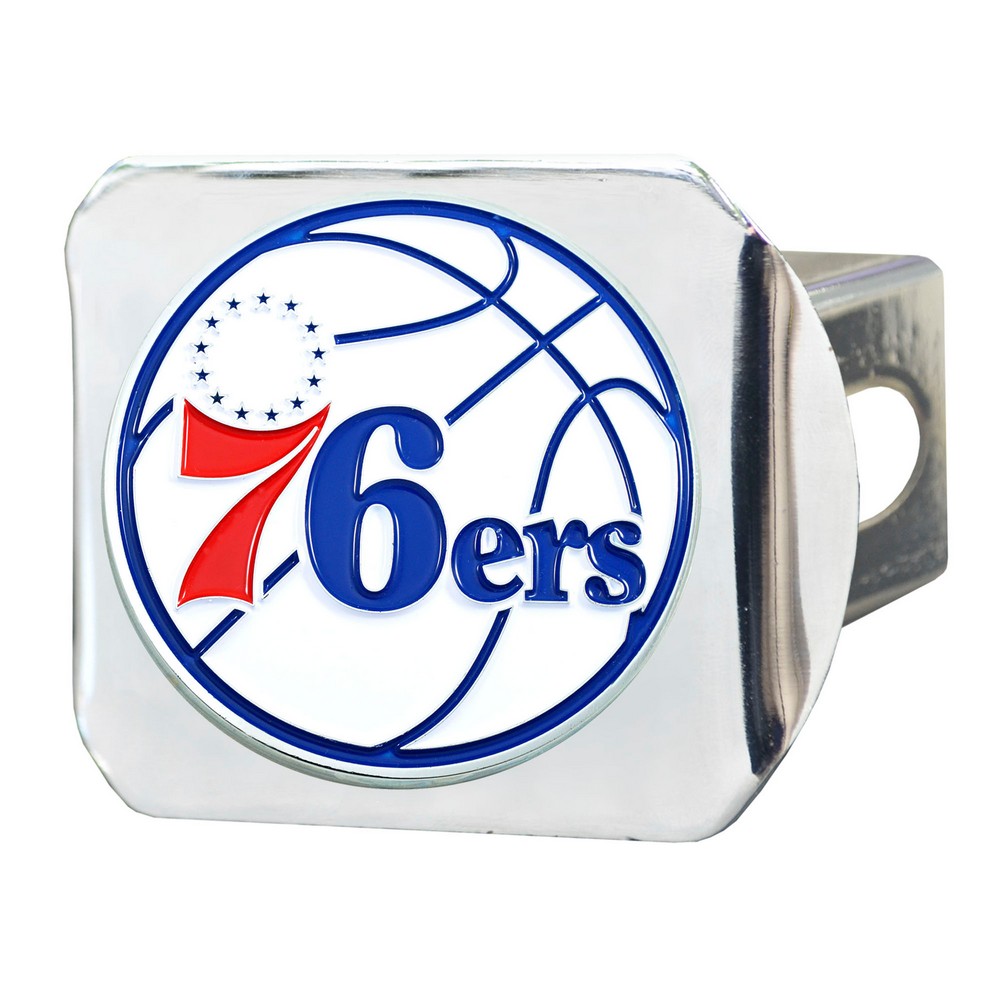 | Philadelphia 76ers Hitch Cover - 3D Color Emblem Completely wraps your hitch to keep all debris out Fits all 2 in. Class III hitches for a secure installation Made of chromed metal for a sleek design 3-D molded design to clearly outline the team logo Attaches without use of tools for an easy on and off; pin is not included Keeps your hitch clear of debris NBA - Philadelphia 76ers in Pennsylvania NBA National Basketball Association |