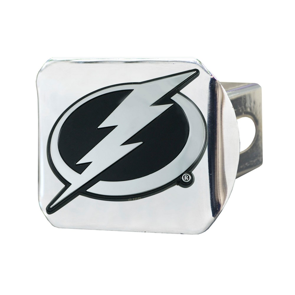 | Tampa Bay Lightning Chrome Metal Hitch Cover with Chrome Metal 3D Emblem Completely wraps your hitch to keep all debris out Fits all 2 in. Class III hitches for a secure installation Made of chromed metal for a sleek design 3-D molded design to clearly outline the team logo Attaches without use of tools for an easy on and off; pin is not included Keeps your hitch clear of debris NHL - Tampa Bay Lightning in Florida NHL National Hockey League |