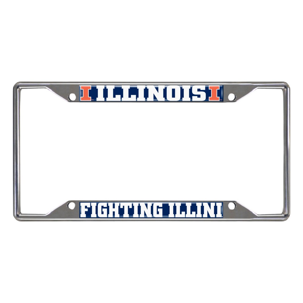 | Illinois Illini Chrome Metal License Plate Frame, 6.25in x 12.25in Made of chrome metal with a durable finish that resists the elements Team logo is domed and features vibrant colors that catch the eye 4 pre-drilled holes ensure a safe and secure fit, plus no rattling noises while driving Slimline design helps keep registration tag visible Fits most standard plates, measures 6.25" x 12.25" Screws not included University of Illinois in Illinois |