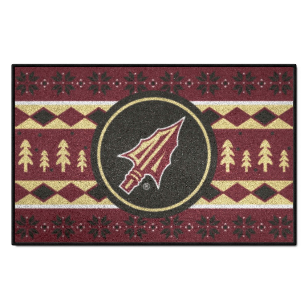 | Florida State Seminoles Holiday Sweater Starter Mat Accent Rug - 19in. x 30in. 9 Ounce, 100 % Nylon Face Recycled vinyl backing for a durable and longer-lasting product Machine made and tufted in the USA Non-skid backing with serged borders for added durability Machine washable; vacuum regularly and spot clean for any easy and quick clean Officially licensed and chromojet-printed in true team colors for vibrant, lasting color Florida State University in Florida |