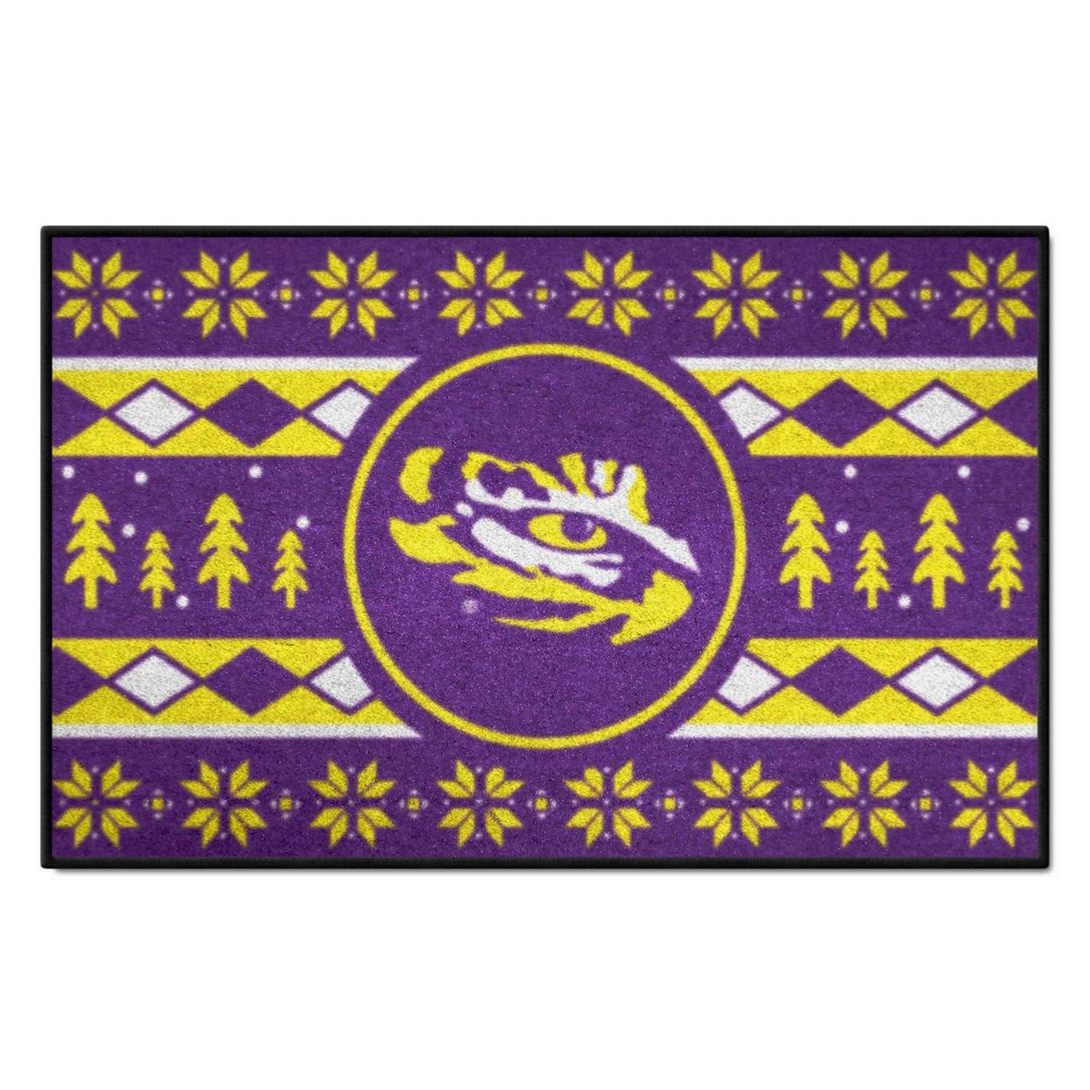 | LSU Tigers Holiday Sweater Starter Mat Accent Rug - 19in. x 30in. 9 Ounce, 100 % Nylon Face Recycled vinyl backing for a durable and longer-lasting product Machine made and tufted in the USA Non-skid backing with serged borders for added durability Machine washable; vacuum regularly and spot clean for any easy and quick clean Officially licensed and chromojet-printed in true team colors for vibrant, lasting color Louisiana State University in Louisiana |