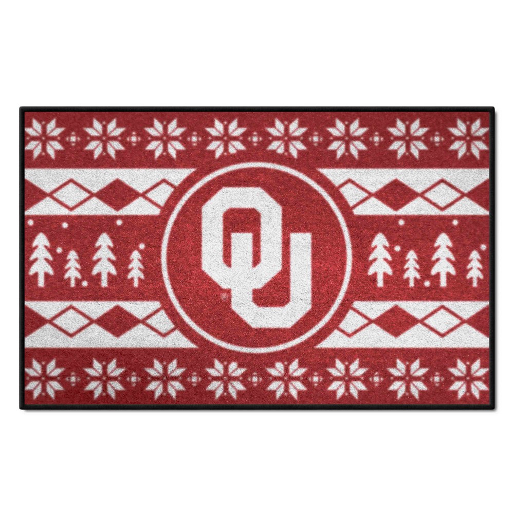 | Oklahoma Sooners Holiday Sweater Starter Mat Accent Rug - 19in. x 30in. 9 Ounce, 100 % Nylon Face Recycled vinyl backing for a durable and longer-lasting product Machine made and tufted in the USA Non-skid backing with serged borders for added durability Machine washable; vacuum regularly and spot clean for any easy and quick clean Officially licensed and chromojet-printed in true team colors for vibrant, lasting color University of Oklahoma in Oklahoma |