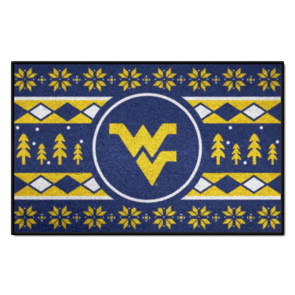 | West Virginia Mountaineers Holiday Sweater Starter Mat Accent Rug - 19in. x 30in. 9 Ounce, 100 % Nylon Face Recycled vinyl backing for a durable and longer-lasting product Machine made and tufted in the USA Non-skid backing with serged borders for added durability Machine washable; vacuum regularly and spot clean for any easy and quick clean Officially licensed and chromojet-printed in true team colors for vibrant, lasting color West Virginia University in West Virginia |