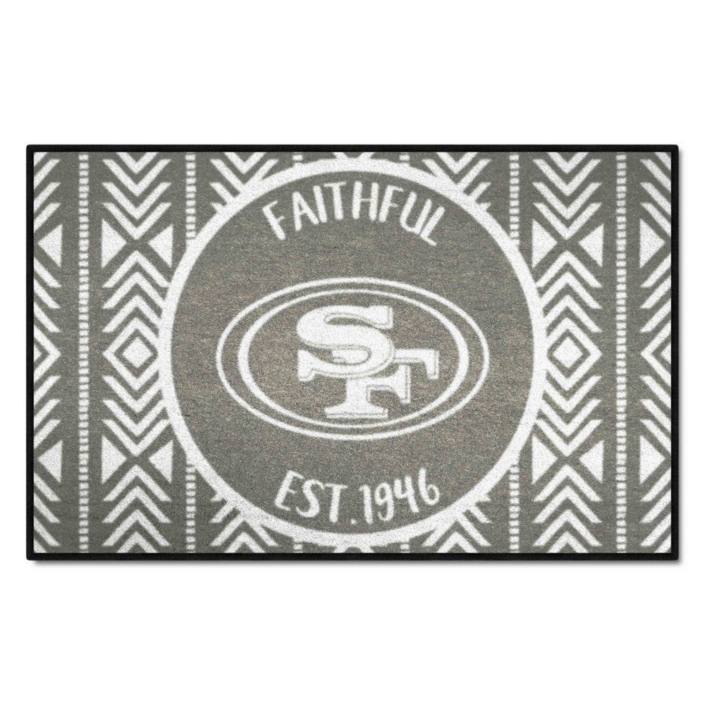 | San Francisco 49ers Southern Style Starter Mat Accent Rug - 19in. x 30in. 9 Ounce, 100 % Nylon Face Recycled vinyl backing for a durable and longer-lasting product Machine made and tufted in the USA Non-skid backing with serged borders for added durability Machine washable; vacuum regularly and spot clean for any easy and quick clean Officially licensed and chromojet-printed in true team colors for vibrant, lasting color NFL - San Francisco 49ers in California NFL National Football League |