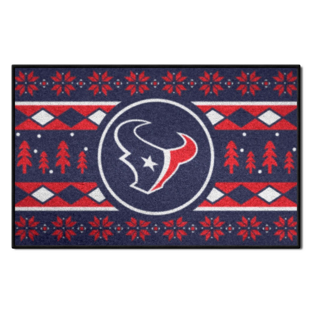 | Houston Texans Holiday Sweater Starter Mat Accent Rug - 19in. x 30in. 9 Ounce, 100 % Nylon Face Recycled vinyl backing for a durable and longer-lasting product Machine made and tufted in the USA Non-skid backing with serged borders for added durability Machine washable; vacuum regularly and spot clean for any easy and quick clean Officially licensed and chromojet-printed in true team colors for vibrant, lasting color NFL - Houston Texans in Texas NFL National Football League |