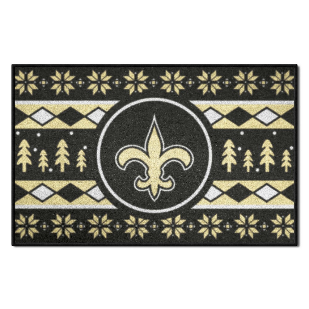 | New Orleans Saints Holiday Sweater Starter Mat Accent Rug - 19in. x 30in. 9 Ounce, 100 % Nylon Face Recycled vinyl backing for a durable and longer-lasting product Machine made and tufted in the USA Non-skid backing with serged borders for added durability Machine washable; vacuum regularly and spot clean for any easy and quick clean Officially licensed and chromojet-printed in true team colors for vibrant, lasting color NFL - New Orleans Saints in Louisiana NFL National Football League |