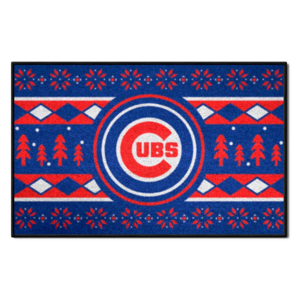 | Chicago Cubs Holiday Sweater Starter Mat Accent Rug - 19in. x 30in. 9 Ounce, 100 % Nylon Face Recycled vinyl backing for a durable and longer-lasting product Machine made and tufted in the USA Non-skid backing with serged borders for added durability Machine washable; vacuum regularly and spot clean for any easy and quick clean Officially licensed and chromojet-printed in true team colors for vibrant, lasting color MLB - Chicago Cubs in Illinois MLB Major League Baseball |