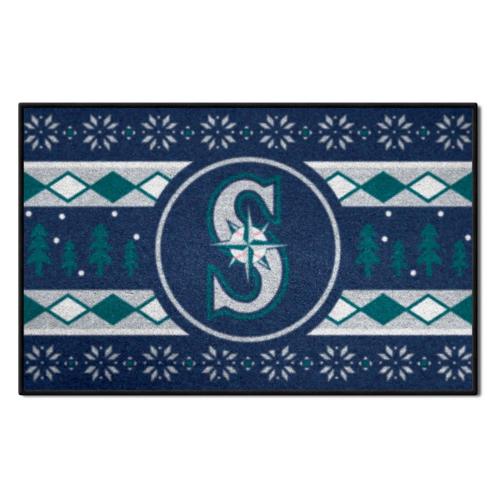 | Seattle Mariners Holiday Sweater Starter Mat Accent Rug - 19in. x 30in. 9 Ounce, 100 % Nylon Face Recycled vinyl backing for a durable and longer-lasting product Machine made and tufted in the USA Non-skid backing with serged borders for added durability Machine washable; vacuum regularly and spot clean for any easy and quick clean Officially licensed and chromojet-printed in true team colors for vibrant, lasting color MLB - Seattle Mariners in Washington MLB Major League Baseball |