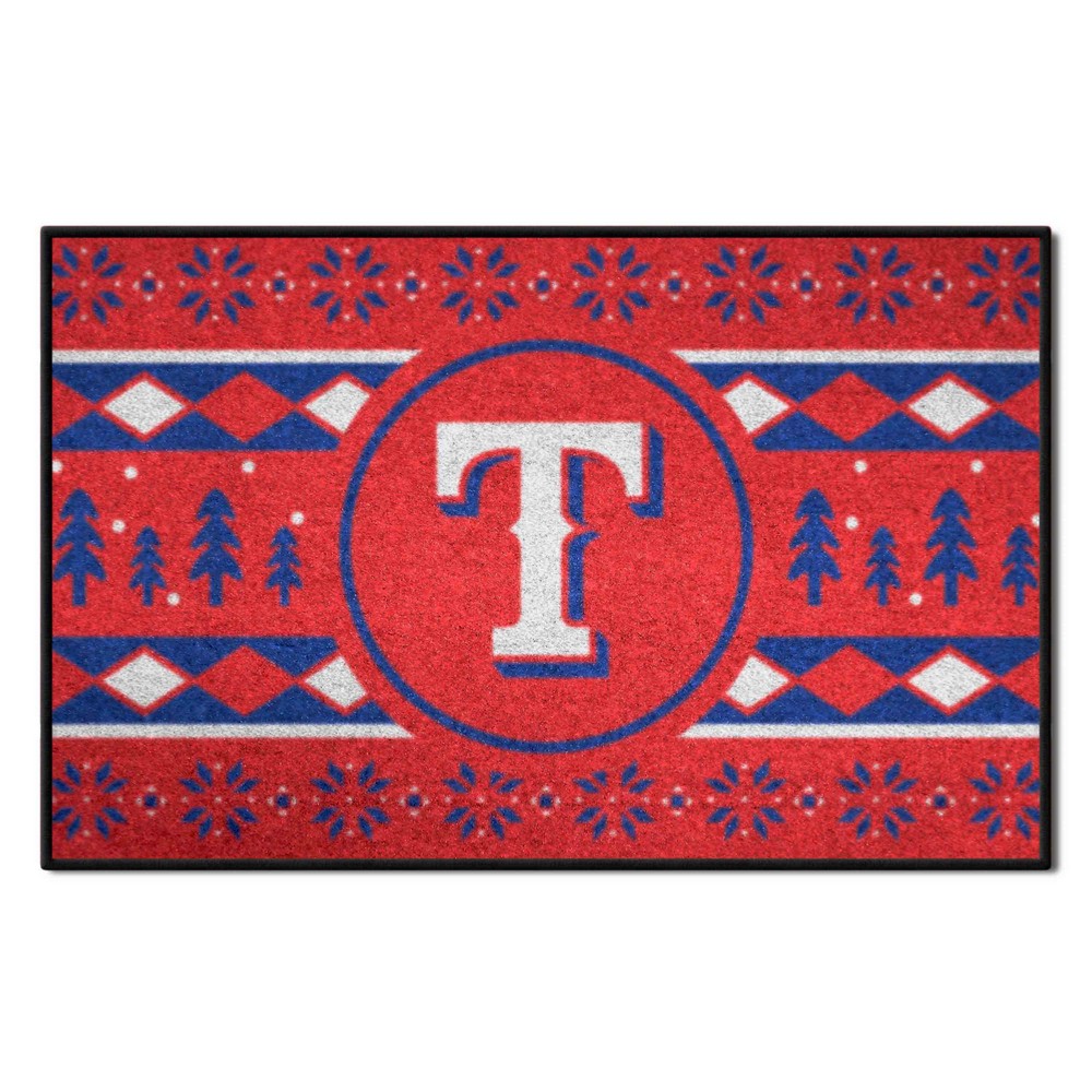 | Texas Rangers Holiday Sweater Starter Mat Accent Rug - 19in. x 30in. 9 Ounce, 100 % Nylon Face Recycled vinyl backing for a durable and longer-lasting product Machine made and tufted in the USA Non-skid backing with serged borders for added durability Machine washable; vacuum regularly and spot clean for any easy and quick clean Officially licensed and chromojet-printed in true team colors for vibrant, lasting color MLB - Texas Rangers in Texas MLB Major League Baseball |