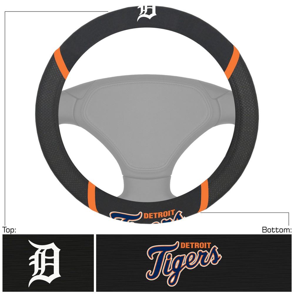 | Detroit Tigers Embroidered Steering Wheel Cover Made of soft grippy mesh and faux suede Vibrant embroidered logos on the top and team names on the bottom Keeps your hands cool in the summer and warm in the winter Fits most cars, trucks, vans and SUVs Strong stitching along edges for sustained sturdiness Easy to install MLB - Detroit Tigers in Michigan MLB Major League Baseball |