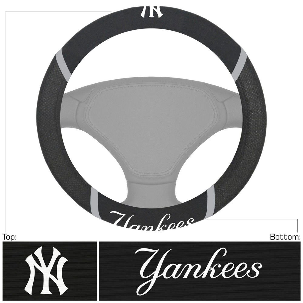 | New York Yankees Embroidered Steering Wheel Cover Made of soft grippy mesh and faux suede Vibrant embroidered logos on the top and team names on the bottom Keeps your hands cool in the summer and warm in the winter Fits most cars, trucks, vans and SUVs Strong stitching along edges for sustained sturdiness Easy to install MLB - New York Yankees in New York MLB Major League Baseball |