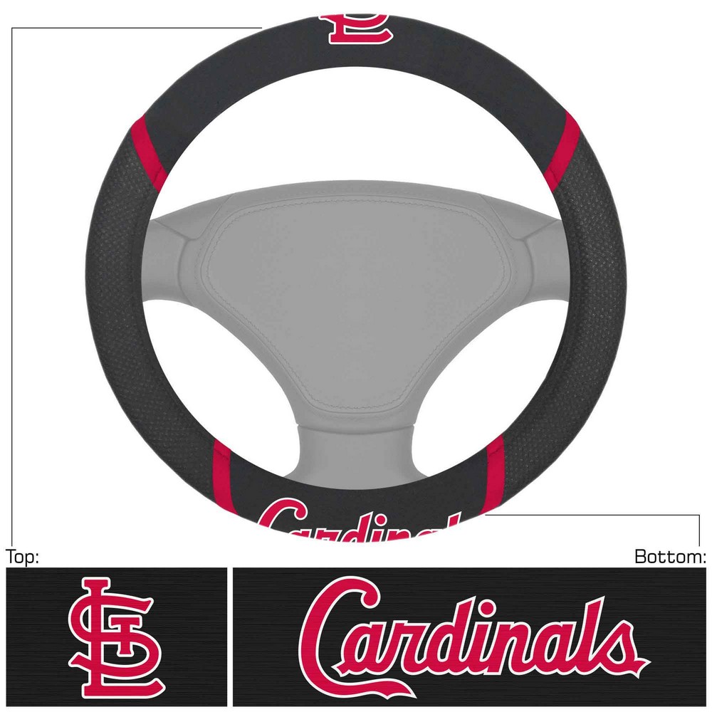 | St. Louis Cardinals Embroidered Steering Wheel Cover Made of soft grippy mesh and faux suede Vibrant embroidered logos on the top and team names on the bottom Keeps your hands cool in the summer and warm in the winter Fits most cars, trucks, vans and SUVs Strong stitching along edges for sustained sturdiness Easy to install MLB - St. Louis Cardinals in Missouri MLB Major League Baseball |