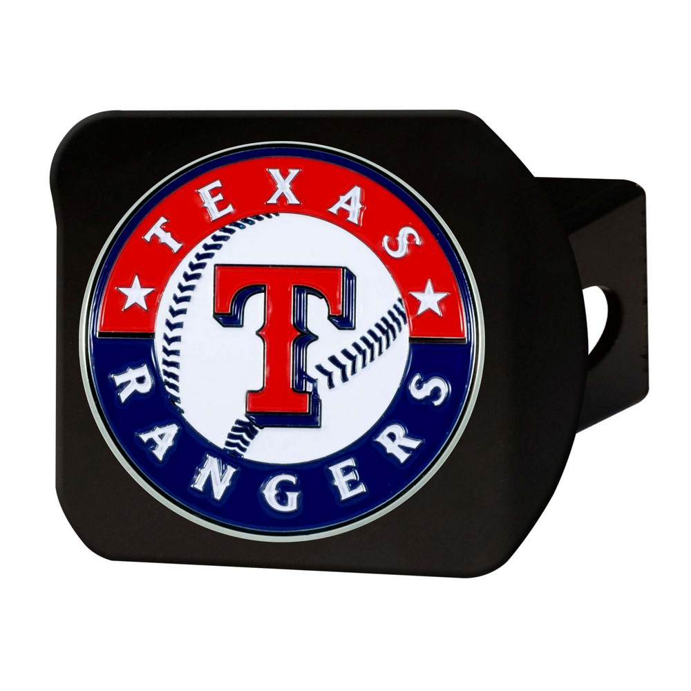 | Texas Rangers Black Metal Hitch Cover - 3D Color Emblem Completely wraps your hitch to keep all debris out Fits all 2 in. Class III hitches for a secure installation Made of metal with a black finish for added style and protection 3-D molded design to clearly outline the team logo Attaches without use of tools for an easy on and off; pin is not included Keeps your hitch clear of debris MLB - Texas Rangers in Texas MLB Major League Baseball |