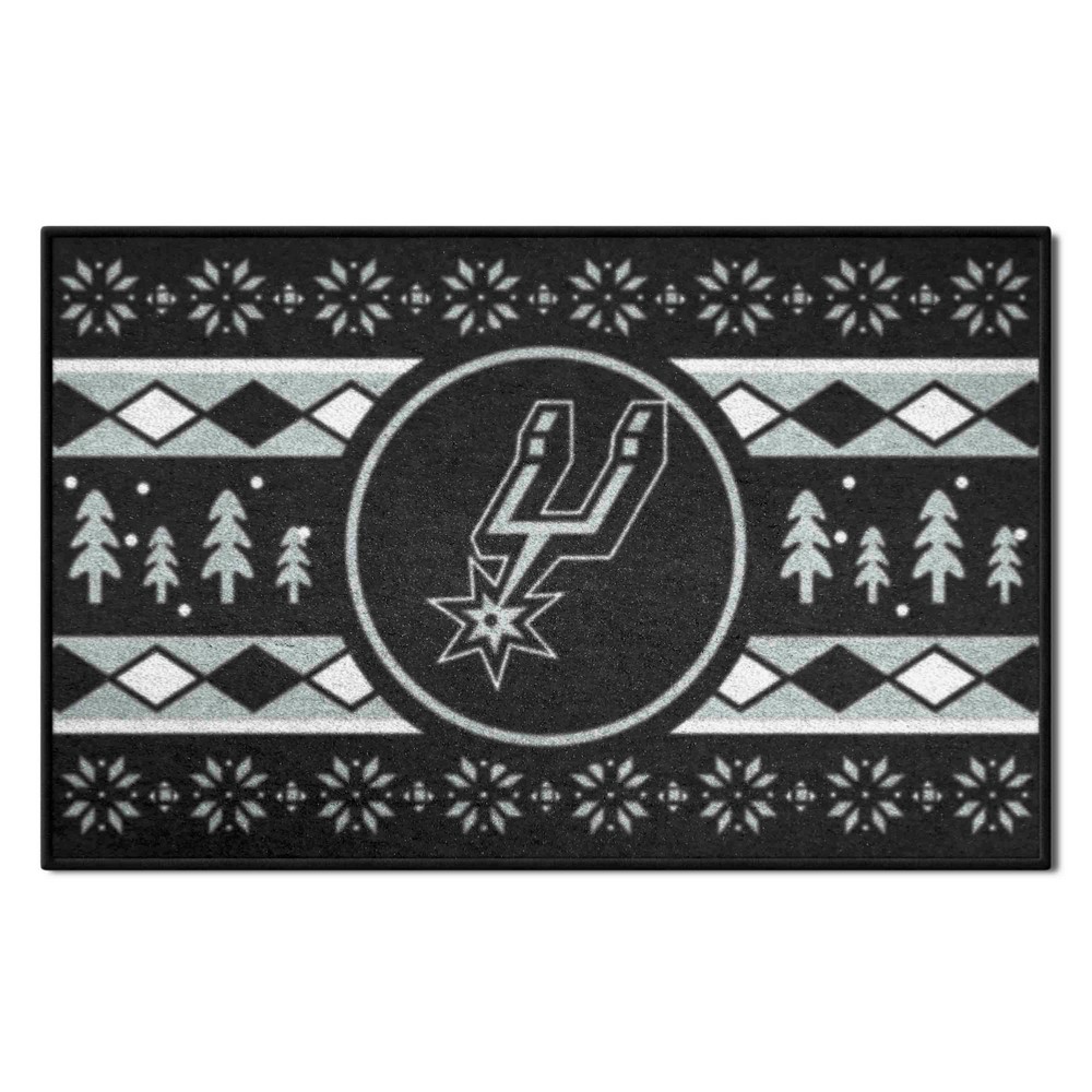 | San Antonio Spurs Holiday Sweater Starter Mat Accent Rug - 19in. x 30in. 9 Ounce, 100 % Nylon Face Recycled vinyl backing for a durable and longer-lasting product Machine made and tufted in the USA Non-skid backing with serged borders for added durability Machine washable; vacuum regularly and spot clean for any easy and quick clean Officially licensed and chromojet-printed in true team colors for vibrant, lasting color NBA - San Antonio Spurs in Texas NBA National Basketball Association |