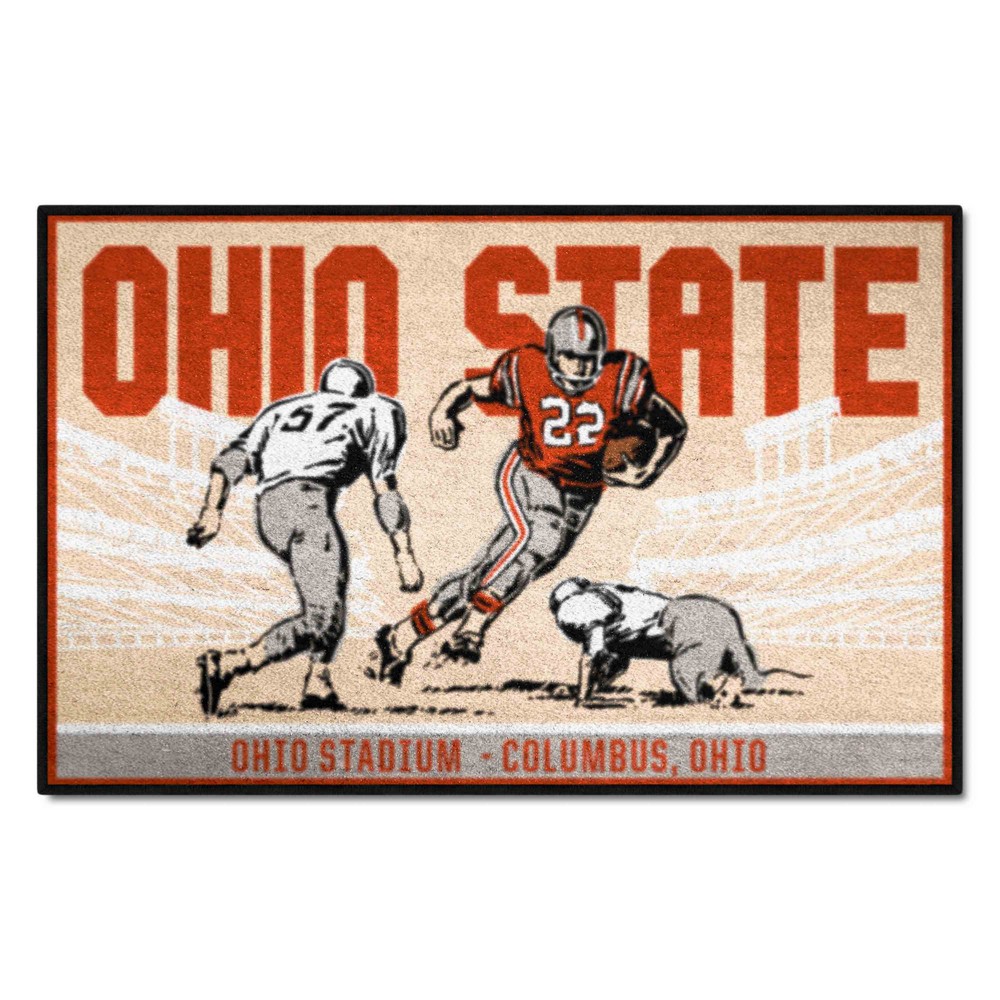 | Ohio State Buckeyes Starter Mat Accent Rug - 19in. x 30in. Ticket Stub Starter Mat 9 Ounce, 100 % Nylon Face Recycled vinyl backing for a durable and longer-lasting product Machine made and tufted in the USA Non-skid backing with serged borders for added durability Machine washable; vacuum regularly and spot clean for any easy and quick clean Officially licensed and chromojet-printed in true team colors for vibrant, lasting color Ohio State University in Ohio |