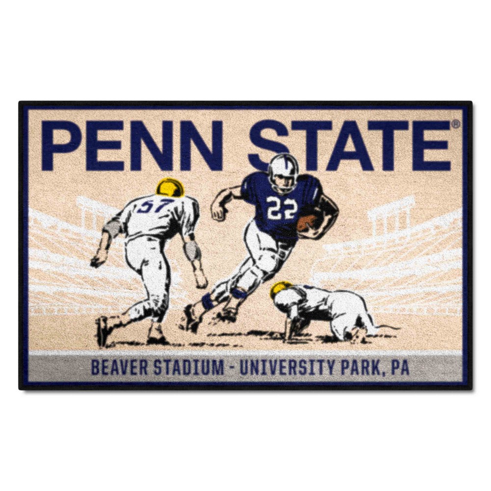 | Penn State Nittany Lions Starter Mat Accent Rug - 19in. x 30in. Ticket Stub Starter Mat 9 Ounce, 100 % Nylon Face Recycled vinyl backing for a durable and longer-lasting product Machine made and tufted in the USA Non-skid backing with serged borders for added durability Machine washable; vacuum regularly and spot clean for any easy and quick clean Officially licensed and chromojet-printed in true team colors for vibrant, lasting color Pennsylvania State University in Pennsylvania |