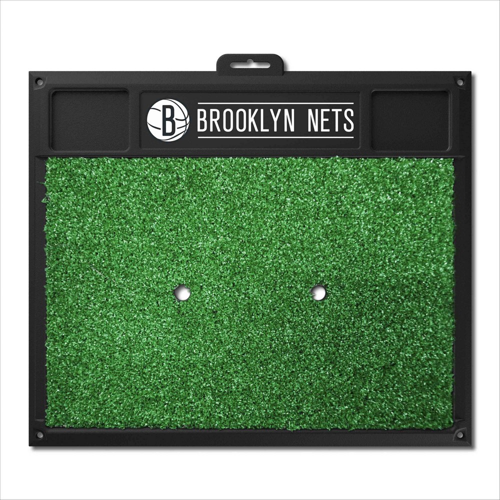 | Brooklyn Nets Golf Hitting Mat Dual tee design for left and right handed golfers Removable tee also accepts wooden tees Stays in place; anchor mat down in all four corners with tees Cups to hold your balls and tees Made of heavy duty vinyl and has a realistic turf Saves your lawn from divots NBA - Brooklyn Nets in New York NBA National Basketball Association |