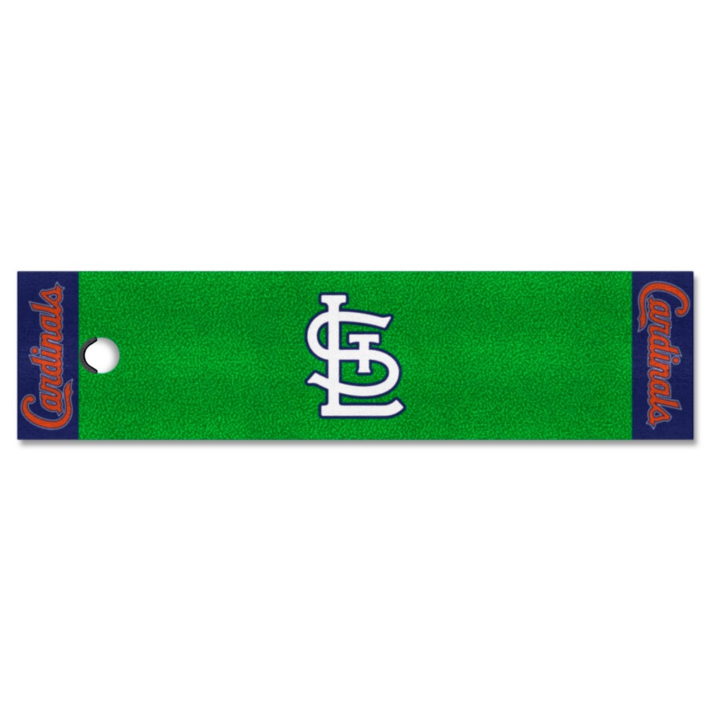 | St. Louis Cardinals Putting Green Mat - 1.5ft. x 6ft. Realistic putting surface (11* on golf Stimpmeter) Includes putting target barrier/backstop Durable vinyl backing keeps mat in place 100% Nylon Face Doubles as a runner when not in use Officially licensed and chromojet printed in true team colors MLB - St. Louis Cardinals in Missouri MLB Major League Baseball |
