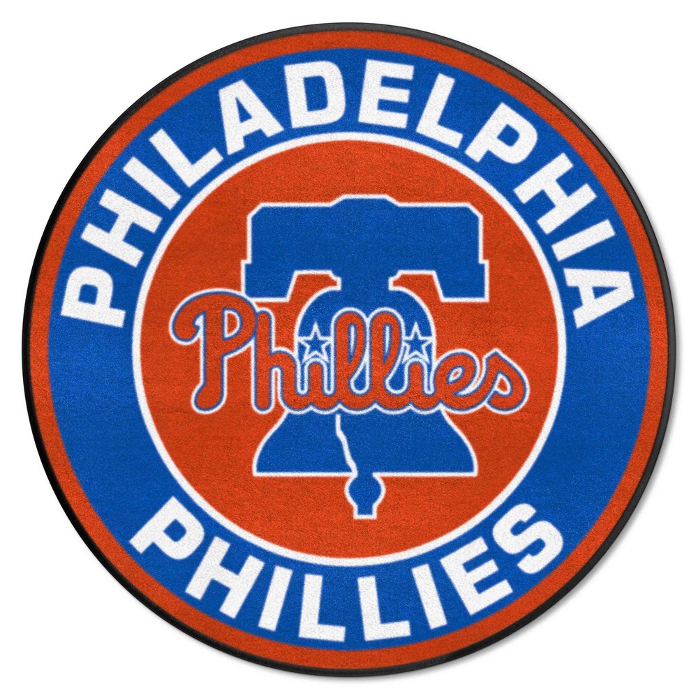 | Philadelphia Phillies Roundel Rug - 27in. Diameter 9 Ounce, 100 % Nylon Face Recycled vinyl backing for a durable and longer-lasting product Machine made and tufted in the USA Non-skid backing with taped borders for added durability Machine washable; vacuum regularly and spot clean for any easy and quick clean Officially licensed and chromojet-printed in true team colors for vibrant, lasting color MLB - Philadelphia Phillies in Pennsylvania MLB Major League Baseball |