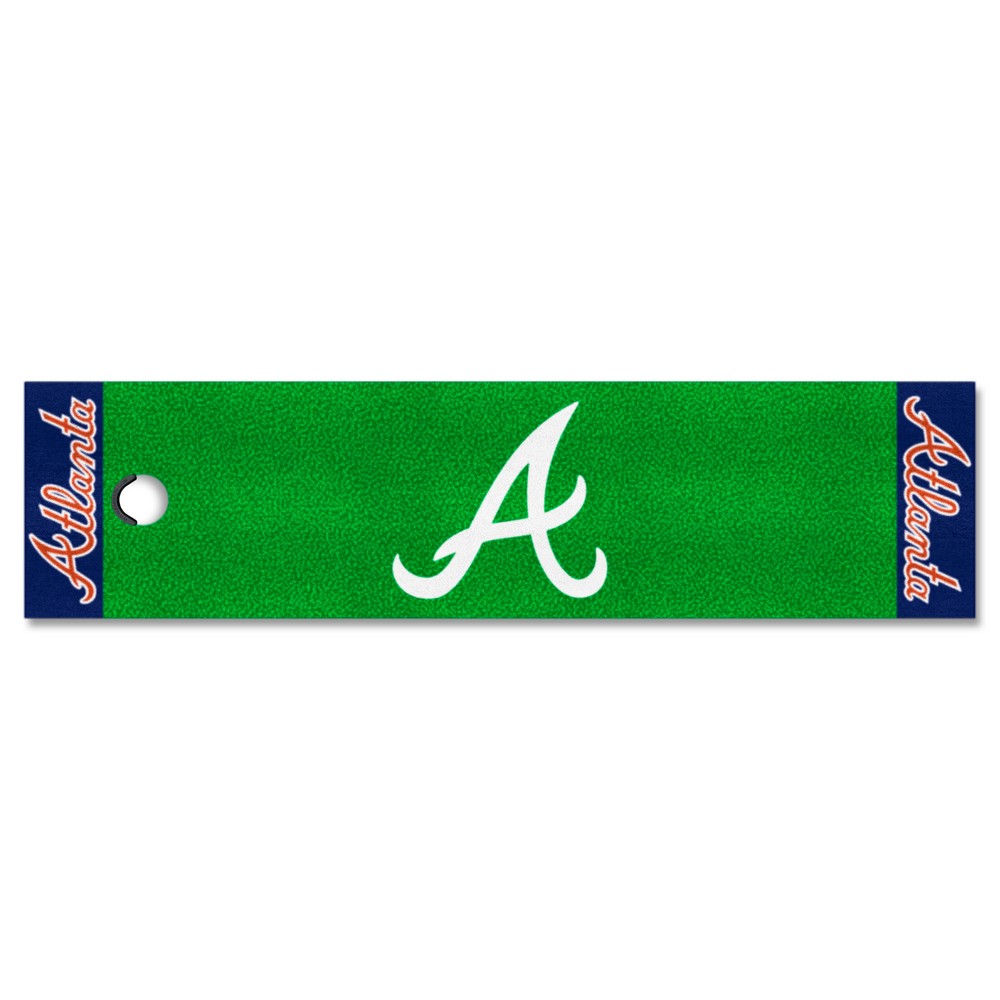 | Atlanta Braves Putting Green Mat - 1.5ft. x 6ft. Realistic putting surface (11* on golf Stimpmeter) Includes putting target barrier/backstop Durable vinyl backing keeps mat in place 100% Nylon Face Doubles as a runner when not in use Officially licensed and chromojet printed in true team colors MLB - Atlanta Braves in Georgia MLB Major League Baseball |