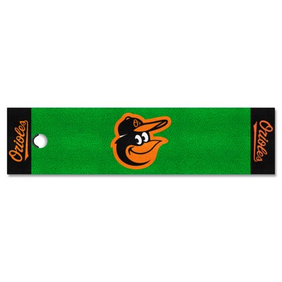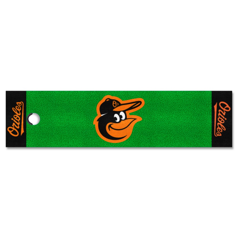 | Baltimore Orioles Putting Green Mat - 1.5ft. x 6ft. Realistic putting surface (11* on golf Stimpmeter) Includes putting target barrier/backstop Durable vinyl backing keeps mat in place 100% Nylon Face Doubles as a runner when not in use Officially licensed and chromojet printed in true team colors MLB - Baltimore Orioles in Maryland MLB Major League Baseball |