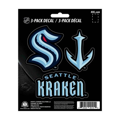 | Seattle Kraken 3 Piece Decal Sticker Set Includes 3 various size decals on a 5in x 6in sheet Adhesive decals are die-cut to shape Printed on premium vinyl material UV resistant lamination for outstanding durability Great for cars, laptops, coolers and other hard surfaces Approximately 5in x 6.25in NHL - Seattle Kraken in Washington NHL National Hockey League |
