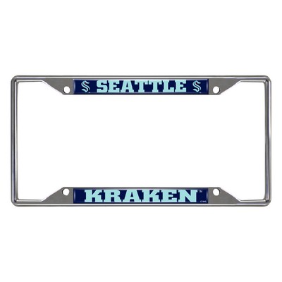 | Seattle Kraken Chrome Metal License Plate Frame, 6.25in x 12.25in Made of chrome metal with a durable finish that resists the elements Team logo is domed and features vibrant colors that catch the eye 4 pre-drilled holes ensure a safe and secure fit, plus no rattling noises while driving Slimline design helps keep registration tag visible Fits most standard plates, measures 6.25" x 12.25" Screws not included NHL - Seattle Kraken in Washington NHL National Hockey League |