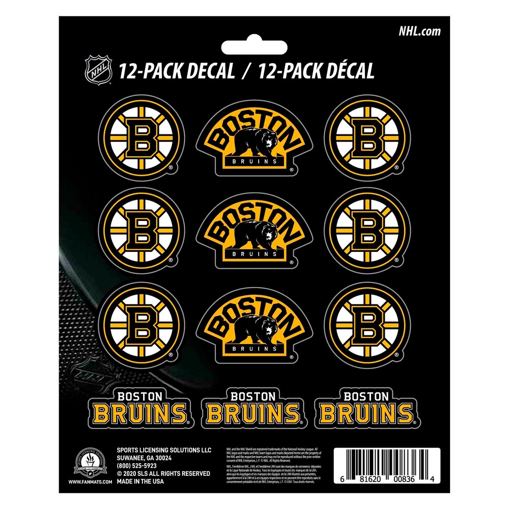 | Boston Bruins 12 Count Mini Decal Sticker Pack Includes12 small size decals on a 5in x 6in sheet Adhesive decals are die-cut to shape Printed on premium vinyl material UV resistant lamination for outstanding durability Great for cars, laptops, coolers and other hard surfaces Approximately 5in x 6.25in NHL - Boston Bruins in Massachusetts NHL National Hockey League |