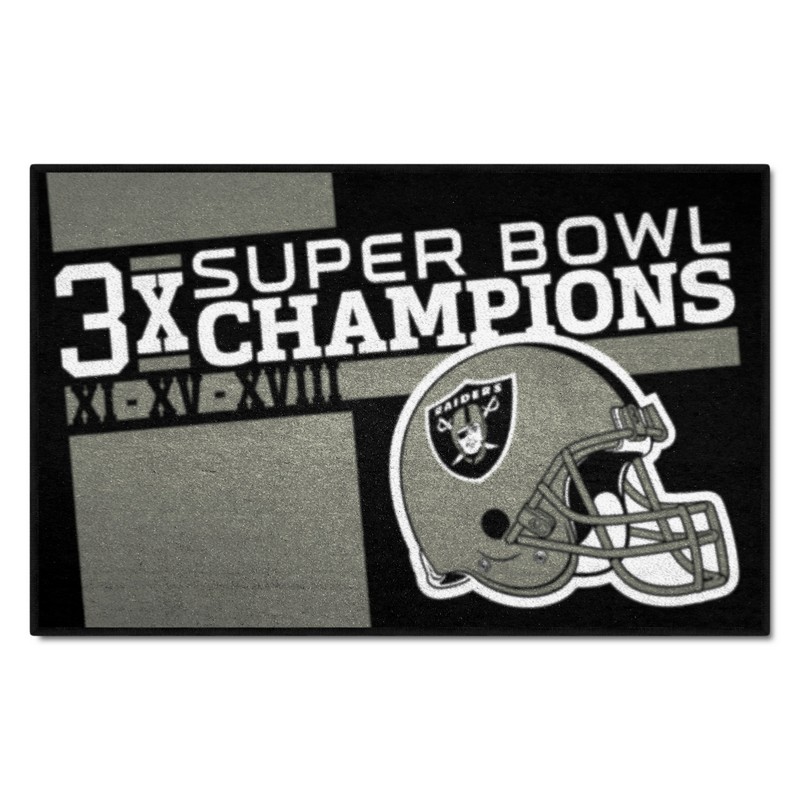| Las Vegas Raiders Dynasty Starter Mat Accent Rug - 19in. x 30in. 9 Ounce, 100 % Nylon Face Recycled vinyl backing for a durable and longer-lasting product Machine made and tufted in the USA Non-skid backing with serged borders for added durability Machine washable; vacuum regularly and spot clean for any easy and quick clean Officially licensed and chromojet-printed in true team colors for vibrant, lasting color NFL - Las Vegas Raiders in Nevada NFL National Football League |
