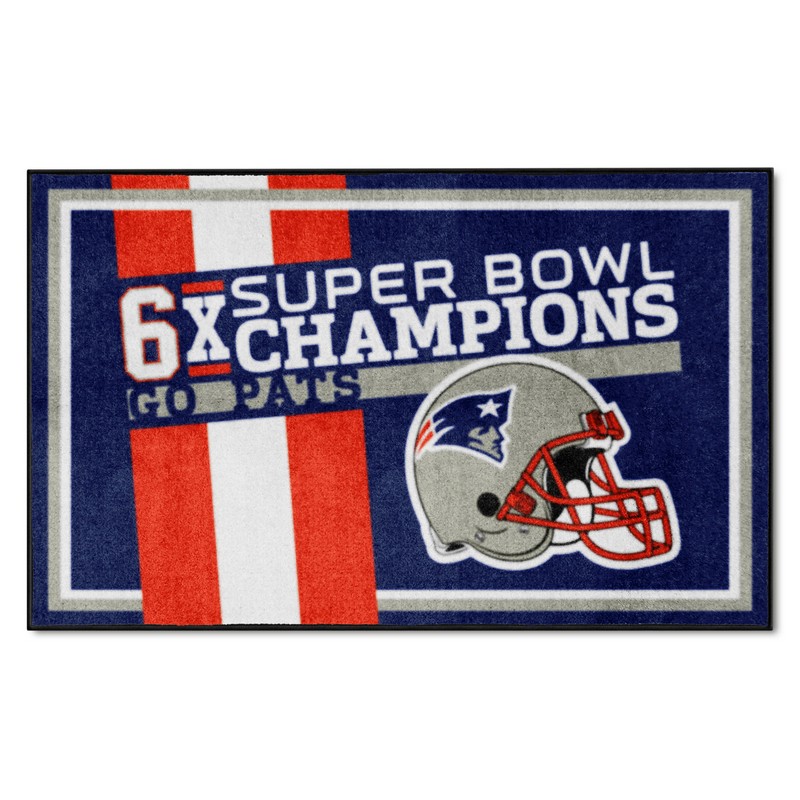 | New England Patriots Dynasty 4ft. x 6ft. Plush Area Rug 23.5 oz., 100% Nylon Face Duragon latex backing for a durable and longer-lasting product Machine made in the USA Non-skid backing to ensure stability Vacuum regularly and spot clean Chromojet-printed in true team colors NFL - New England Patriots in Massachusetts NFL National Football League |