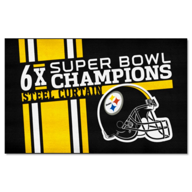 | Pittsburgh Steelers Ulti-Mat Rug - 5ft. x 8ft. 9 Ounce, 100 % Nylon Face Recycled vinyl backing for a durable and longer-lasting product Machine made and tufted in the USA Non-skid backing with serged borders for added durability Machine washable; vacuum regularly and spot clean for any easy and quick clean Officially licensed and chromojet-printed in true team colors for vibrant, lasting color NFL - Pittsburgh Steelers in Pennsylvania NFL National Football League |