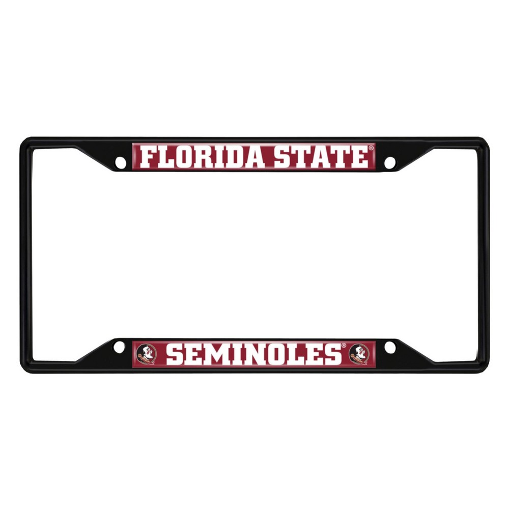 | Florida State Seminoles Metal License Plate Frame Black Finish Made of metal with a black finish for added style and protection Team logo is domed and features vibrant colors that catch the eye 4 pre-drilled holes ensure a safe and secure fit, plus no rattling noises while driving Slimline design helps keep registration tag visible Fits most standard plates, measures 6.25" x 12.25" Screws not included Florida State University in Florida |