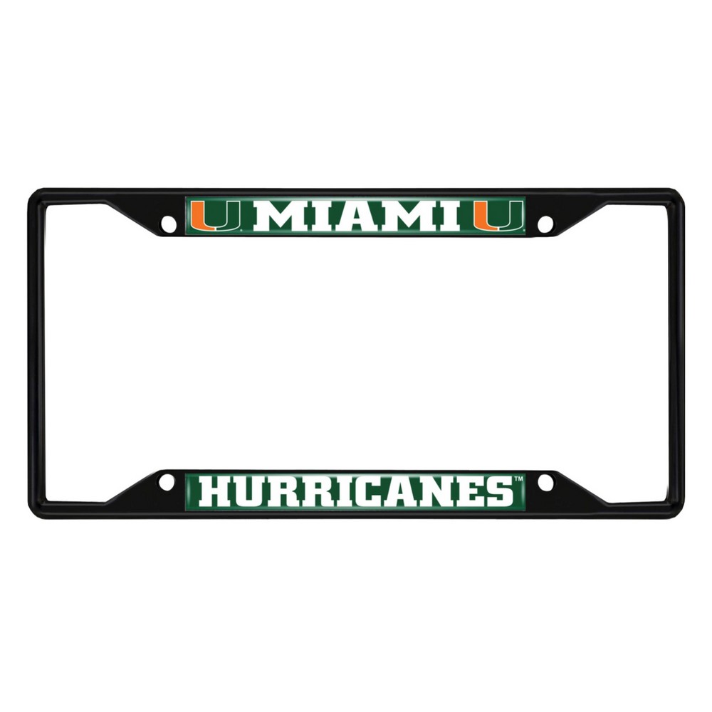 | Miami Hurricanes Metal License Plate Frame Black Finish Made of metal with a black finish for added style and protection Team logo is domed and features vibrant colors that catch the eye 4 pre-drilled holes ensure a safe and secure fit, plus no rattling noises while driving Slimline design helps keep registration tag visible Fits most standard plates, measures 6.25" x 12.25" Screws not included University of Miami in Florida |