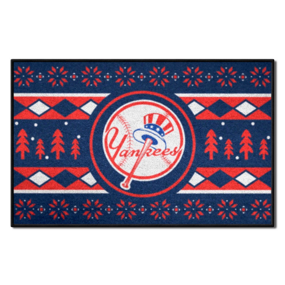 | New York Yankees Holiday Sweater Starter Mat Accent Rug - 19in. x 30in. 9 Ounce, 100 % Nylon Face Recycled vinyl backing for a durable and longer-lasting product Machine made and tufted in the USA Non-skid backing with serged borders for added durability Machine washable; vacuum regularly and spot clean for any easy and quick clean Officially licensed and chromojet-printed in true team colors for vibrant, lasting color MLB - New York Yankees in New York MLB Major League Baseball |