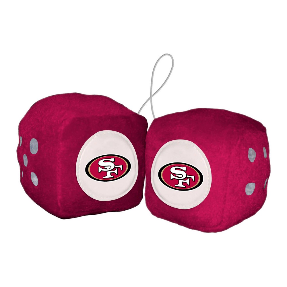 | San Francisco 49ers Team Color Fuzzy Dice Decor 3" Set Soft, High Quality Plush Team Color Dice with Embroidered Team Patch Pair connected by 9in. String for hanging Officially Licensed Each dice is a 3in. Cube Use as a car accessory or in the home or fan cave! NFL - San Francisco 49ers in California NFL National Football League |